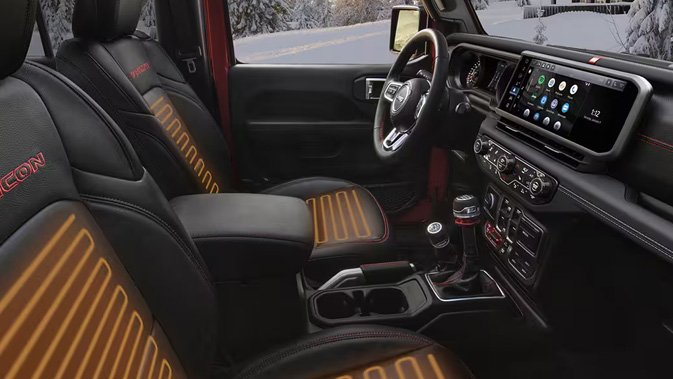 Available on the 2026 Jeep Wrangler are heated 12 way power front seats optimized for incredible comfort on the offer second row passengers room to relax even when they’re off road. trail. Best-in-Class rear-seat headroom and legroom on four-door