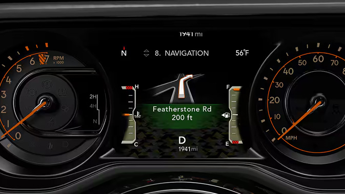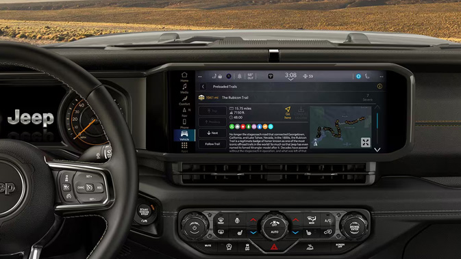 Explore on and off road navigation options on our available Uconnect 5 NAV system via the touchscreen with a 12.3 inch center display.